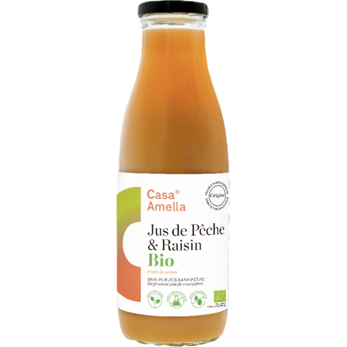 Un jus 100 % naturel, composé à parts égales de jus de pêche et de jus de raisin issus de l’agriculture biologique. Ce mélange savoureux allie la douceur juteuse de la pêche à la fraîcheur fruitée du raisin, pour une boisson équilibrée, pleine de goût et sans aucun additif.