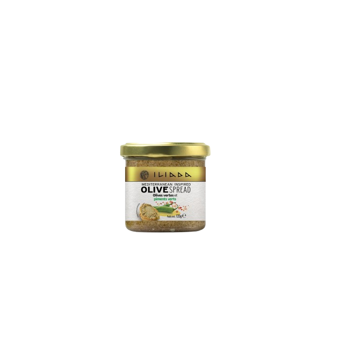 Des olives vertes, dans une recette de tapenade douce et savoureuse au goût fruité unique sont combinées avec des piments verts mûris au soleil, de l'huile d'olive extra vierge aromatique et des épices grecques, prête à sublimer tous vos apéritifs et en cuisine.